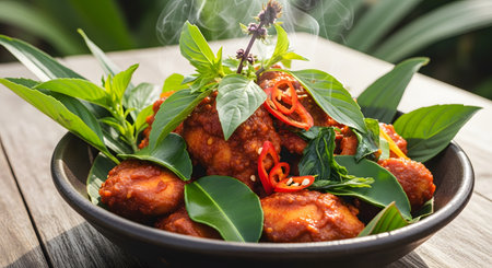 A bowl of Telur Balado, a traditional Indonesian dish of fried eggs coated in spicy red chili sauce. Garnished with fresh basil leaves and sliced red chilies, the dish steams invitingly in a rustic dark bowl.