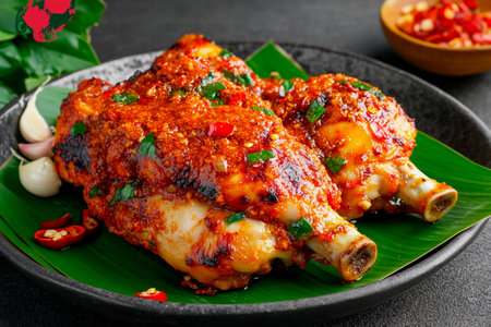 A close-up view of traditional Indonesian spicy grilled whole chicken, locally known as Ayam Bakar, served on a vibrant green banana leaf, highlighting its rich textures and seasonings.