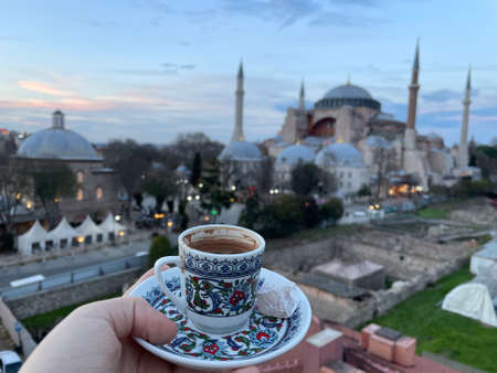 hand of tourist with turkish tradituional coffee drink on background of the hagia sophia cathedral church, Istanbul Turkey