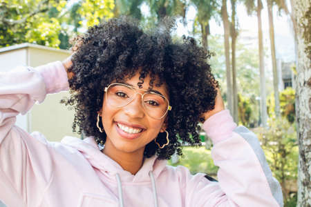 beautiful african american woman portrait with glasses smiling touching her curly hair outdoors in public park sunny day