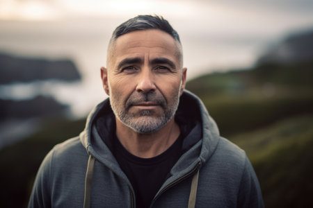 Portrait of a handsome middle-aged man with gray hair and beard looking at the camera outdoors