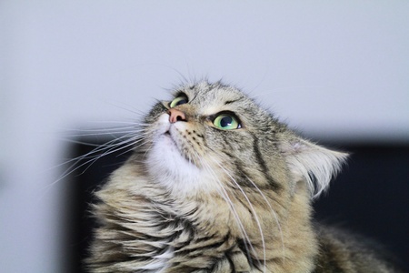 head of a surprised cat close up on a light background