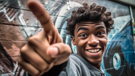 Goodhumoured young man pointing finger to camera with cheerful smile Indoor photo of carefree curly african guy expressing good emotions : Generative AI