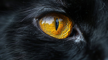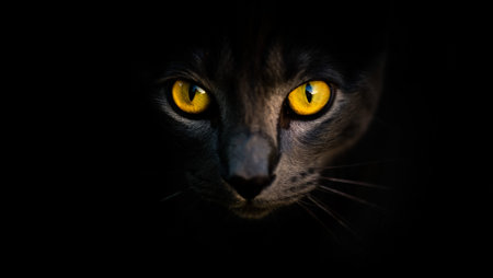 Mysterious Black Cats Piercing Yellow Eyes Emerge from Total Darkness Creating an Intense and Hypnotic Gaze Symbolizing Stealth Intuition and the Unseen Presence Highlighting Authenticity and Connect.