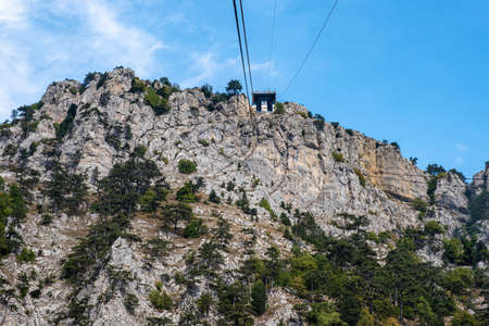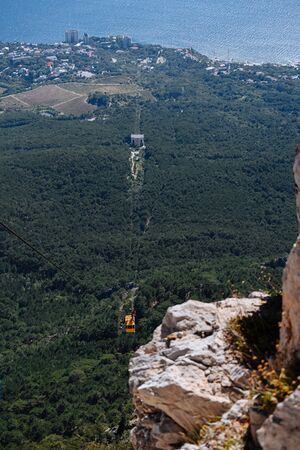 Mountain view from the funicular climbing by cable car to top of Ai-Petri mountain in Crimea
