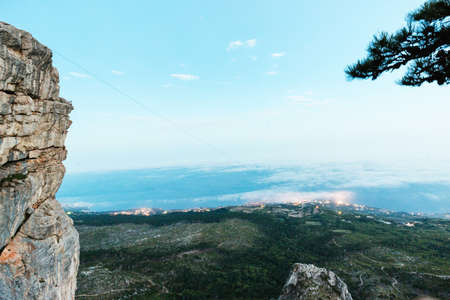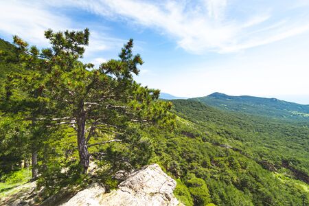 Photo from top of Ai-Petri mountain, tree grows on rock, beautiful horizon and blue sky with white clouds