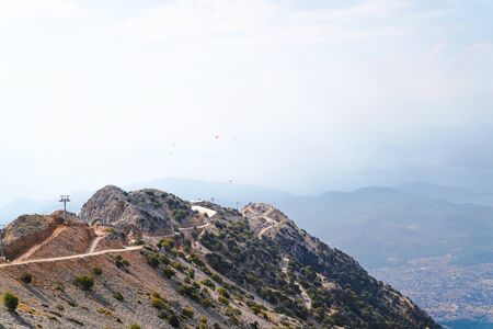 Mountain Babadag is ideal place for paragliding and some paragliders flying on the mountain and Fethiye city and Mediterranean sea in background