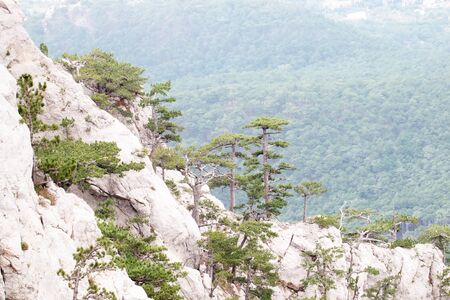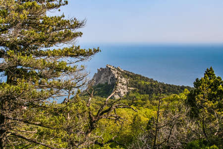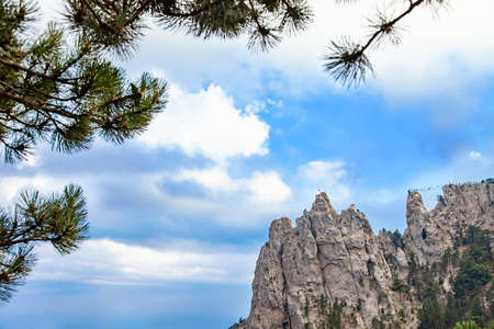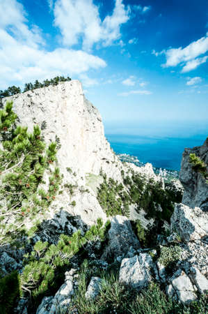 High rocks Ai-Petri of Crimean mountains. Black sea coast and blue sky with clouds. Russia. pine mountain Crimean forest