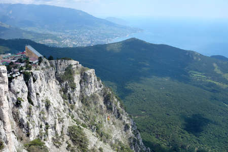 Cableway in the summer. Funicular descends from the mountain. View from the mountains to the sea.