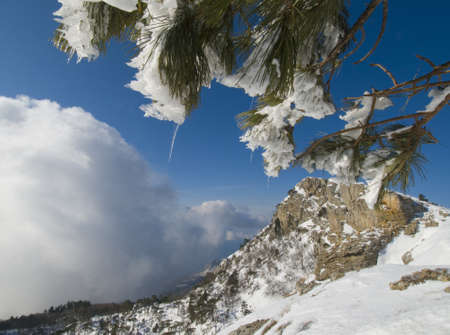 This is a cheerful winter day in mountains Frost pine branch is in the foreground, rocky mountain and white cloud are in the background