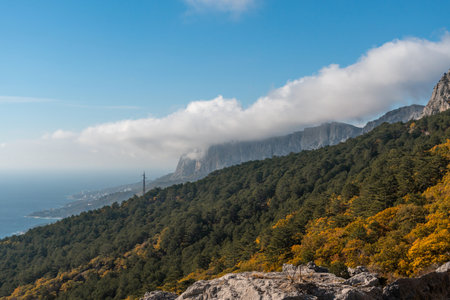 Mountains Crimea Coastline Autumn: Panoramic view showcasing Crimean mountains, coastal scenery, autumn foliage. Low clouds partially obscure distant sea.