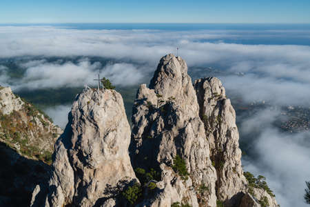 Mountain in the clouds with a crucifix around Ai-Petri in Crimea
