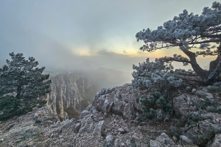 Pines and fog on the top of Mount Ai-Petri in Crimea