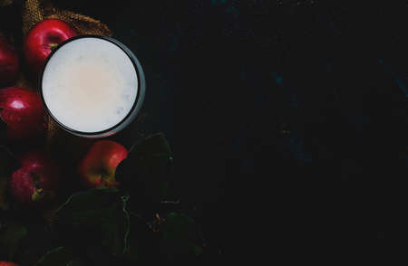 Apple cider in beer glass with fresh apples, black background, top view
