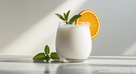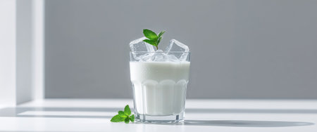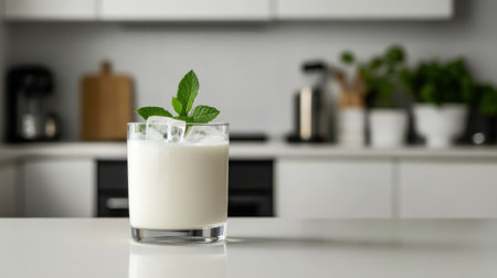 Enjoy a delectable and refreshing glass of creamy milk topped with a sprig of mint, perfect for culinary photography, recipes, and gastronomic delights.