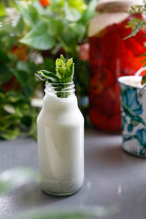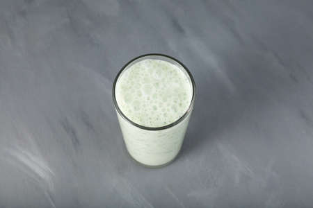 Fermented milk drink in tall glass, top view. Ayran or kefir with green basil and moringa leaves. Gray background, selective focus, copy space.