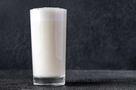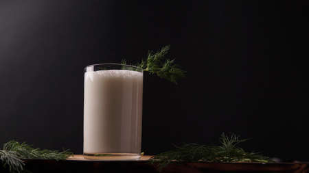 Turkish or Azerbaijan traditional Drink Ayran or Kefir dill in a glass on a wooden table on a black background. Fermented milk drink for diet. Copy space. the concept of healthy nutrition.