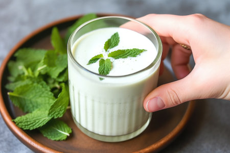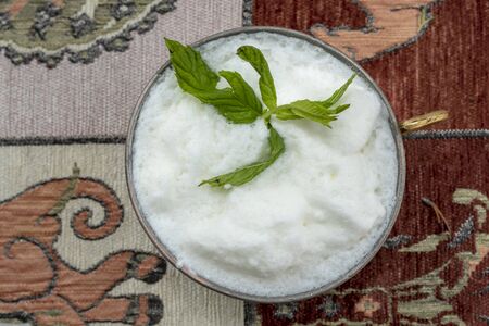 Traditional Turkish drink ayran with mint leaves.