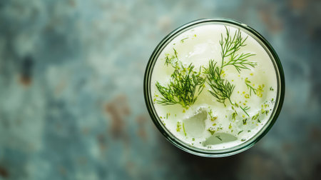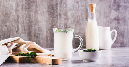 Ayran homemade yogurt drink with dill in a glass on the table web banner