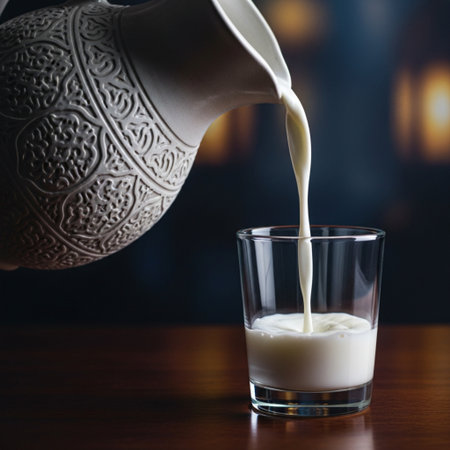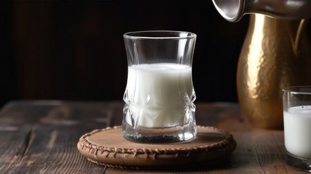 milk or Turkish Ayran drink poured into a glass cup from a bottle. Glass is placed on a wooden stand on a rustic wooden table.