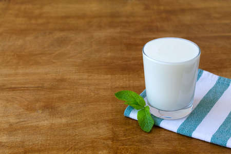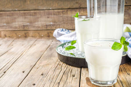 Turkish or Azerbaijan traditional Drink Ayran or Kefir with herbs and with mint in a glass on a wooden table top view. Fermented milk drink for diet. Copy space. the concept of healthy nutrition.