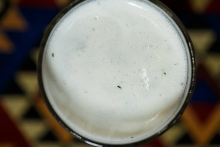 A glass of Ayran, a cold savory yogurt-based beverage, popular across Western Asia, Central Asia, South Asia, and Eastern Europe. The principal ingredients are yogurt, water and salt