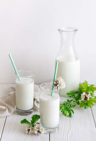 A natural, healthy milk drink. Kefir, yogurt, lassi on a white background. Side view, vertical.