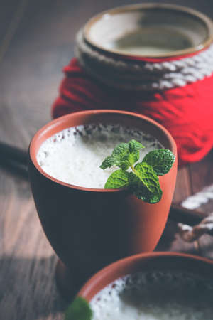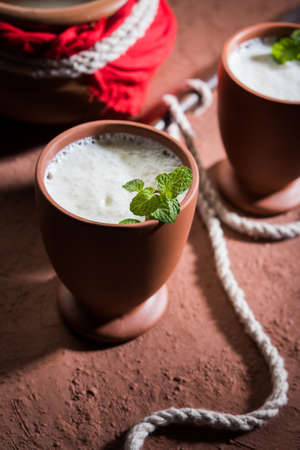 Lassie or lassi in terracotta glass - Lassi is an Authentic Indian cold drink made up of curd and milk and sugar, selective focus