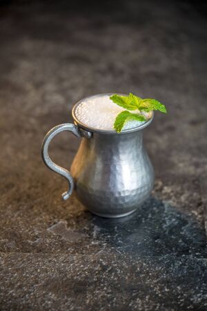 Homemade sparkling buttermilk in a copper mug. traditional turkish drink; Ayran