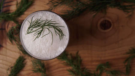 Turkish or Azerbaijan traditional Drink Ayran or Kefir with herbs and dill in a glass on a wooden table top view. Fermented milk drink for diet. Copy space. the concept of healthy nutrition.