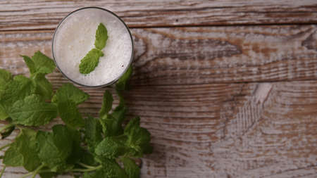 Lassi drink with green mint in glass on wooden background. Probiotic cold dairy drink. healthy, fermented products concept. Copy space. Kefir, milk or yogurt with probiotics. Indian cuisine
