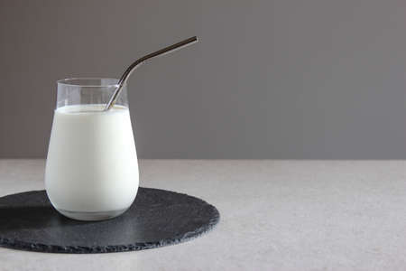 Milk in a glass on a gray background with a hard light.Top of view.