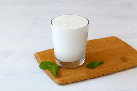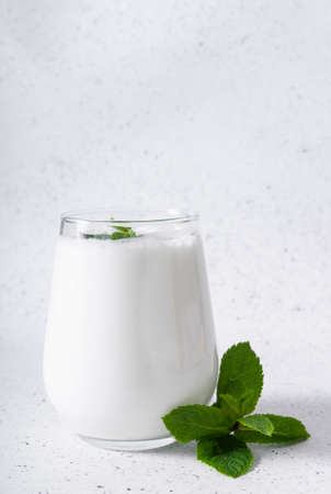 Kefir, a fermented milk product, in a transparent glass, with a mint leaf.