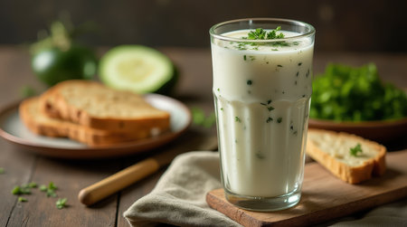 A cold glass of doogh, garnished with herbs, is placed on a wooden table with bread and fresh ingredients, showcasing Afghan cuisine.