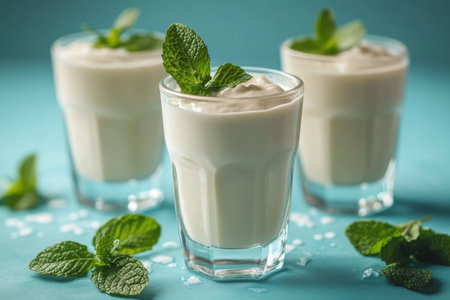 Refreshing mint yogurt drinks served in clear glasses with green leaves in the background during a bright day