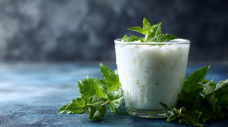 A kefir probiotic yogurt glass mint leaves creamy fresh dairy drink fermented beverage cold green white texture thick rustic natural healthy