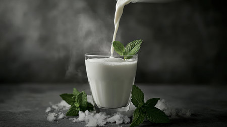 A refreshing glass of milk is being poured, surrounded by fresh mint leaves. The scene exudes a sense of calm and simplicity, emphasizing natural ingredients.