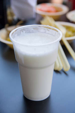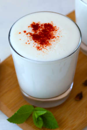 Glass cup of Turkish traditional drink ayran, kefir or buttermilk made from yogurt, healthy food