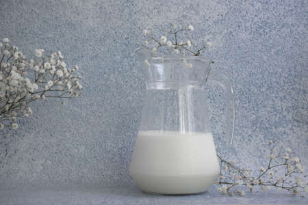 Capture the essence of wholesome, homemade living with this image of creamy kefir, buttermilk, or yogurt being poured from a glass bottle Emphasizing the clean, fresh appeal of natural, probiotic-rich dairy against a white wooden backdrop, it showcases the beauty of gut-friendly beverages and invites health enthusiasts to discover the AI Generative