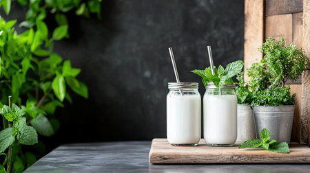 This image showcases two jars of milk garnished with fresh mint, placed on a wood board surrounded by vibrant green herbs, eliciting a fresh, healthy vibe perfect for culinary inspiration.