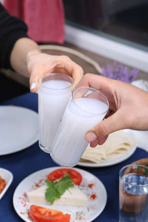 Turkish and Greek Traditional Dinning Table with Special Alcohol Drink Raki. Ouzo and Turkish Raki is a dry anise flavored aperitif that is widely consumed in Turkey, Greece, Cyprus and Lebanon