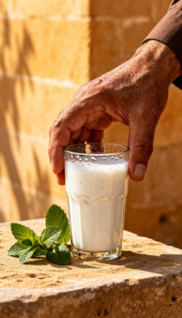 Elderly hand reaching for a glass of fresh milk with mint leaves on stone surface in bright sunlight.