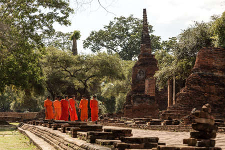 Monks walking to visit ruins of Ayutthaya