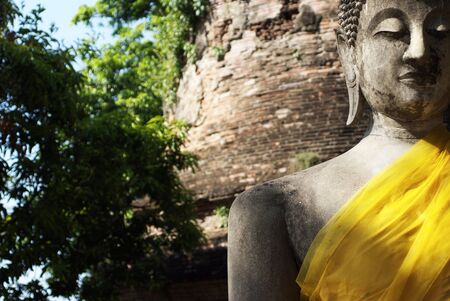 Buddha, a crumbling statue with the peaceful, meditative face and closed eyes, covered with orange cloth at Wat Mahathat in Ayutthaya. The art of Thailand.