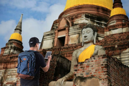 Young man Asian Happy tourists traveling backpacker Tourist traveler on background view