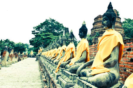 AYUTTHAYA, THAILAND - AUGUST 2 , 2015 : The tourists and row of Buddha statue in Wat Yaichaimongkol Buddhist temple in the city of Ayutthaya Historical Park at Ayutthaya,Thailand on August 2, 2015