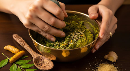 Indian womans hands, decorated with henna, are skillfully grinding turmeric in a stone mortar, reflecting traditional culinary practices and vibrant colors of spices