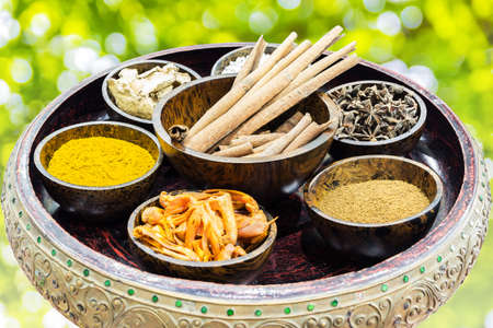 Herbal medicine concept. Assorted spices, ayurvedic medicines, tulsi leaves with seeds and green leaves scattered on wooden background