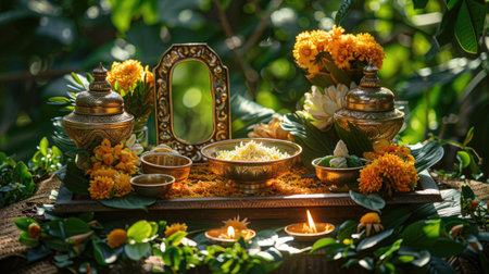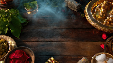 A serene arrangement featuring Hindu ritual items, fresh leaves, and incense, creating a peaceful atmosphere for spiritual ceremonies and personal reflection.
