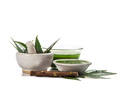 Medicinal Neem leaves in mortar and pestle with neem paste, juice and twigs on white background
